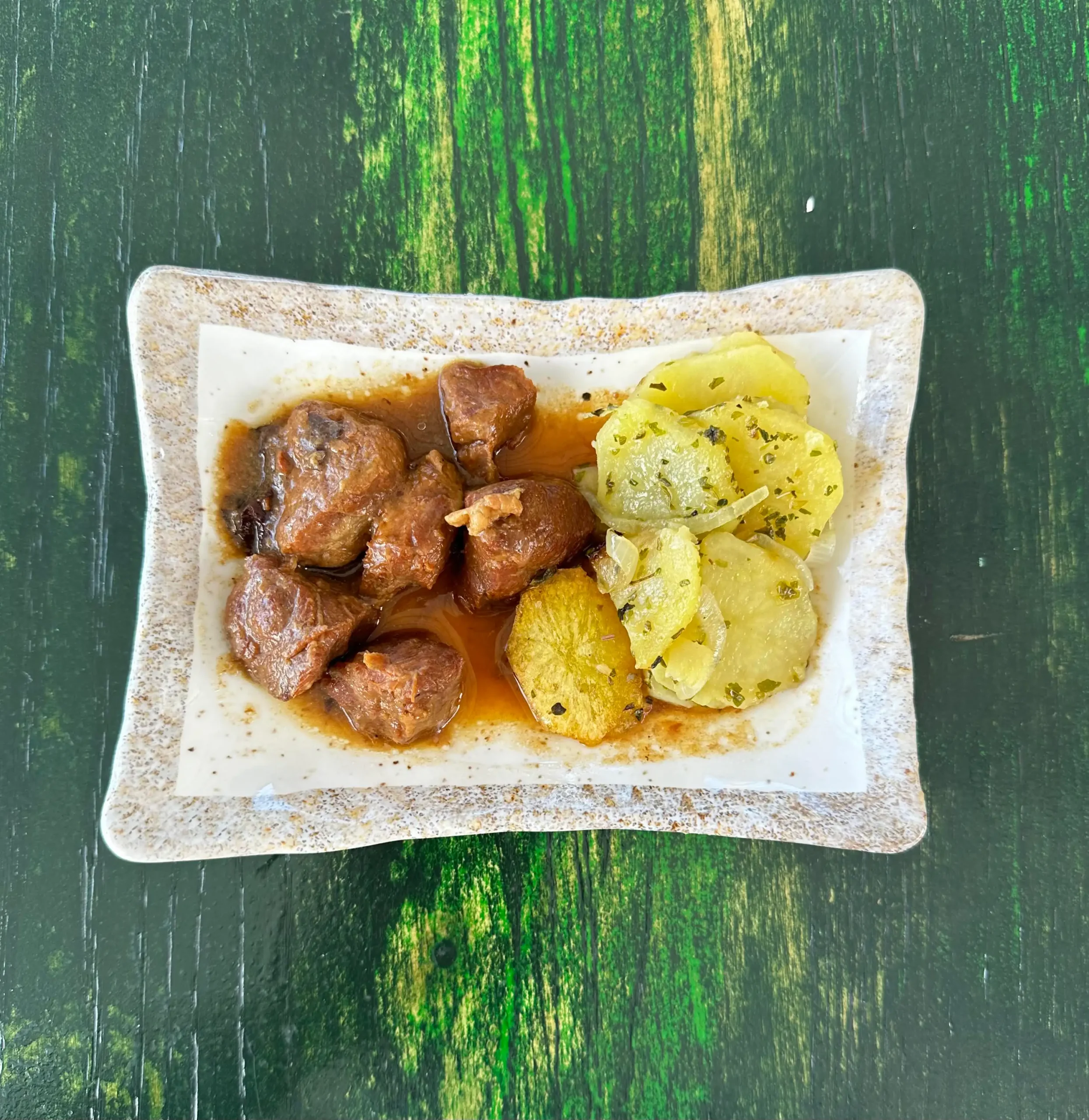 Carrilleras, vino moscatel, cebolla, ajo, hierbas aromáticas, aceite de oliva vigen extra, sal y pimienta.