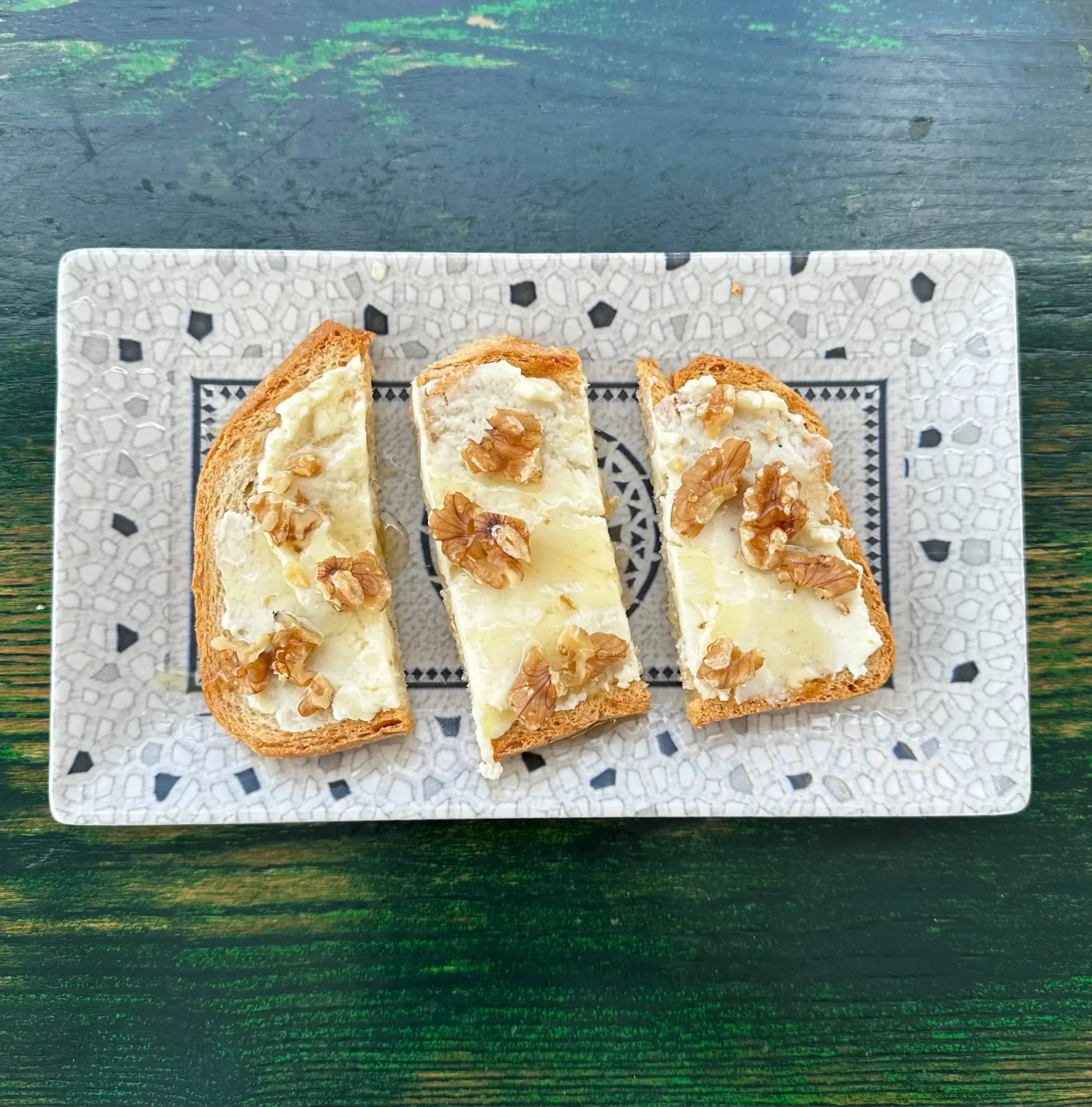 Pan crujiente, rulo de cabra, nueces, miel, aceite de oliva virgen extra