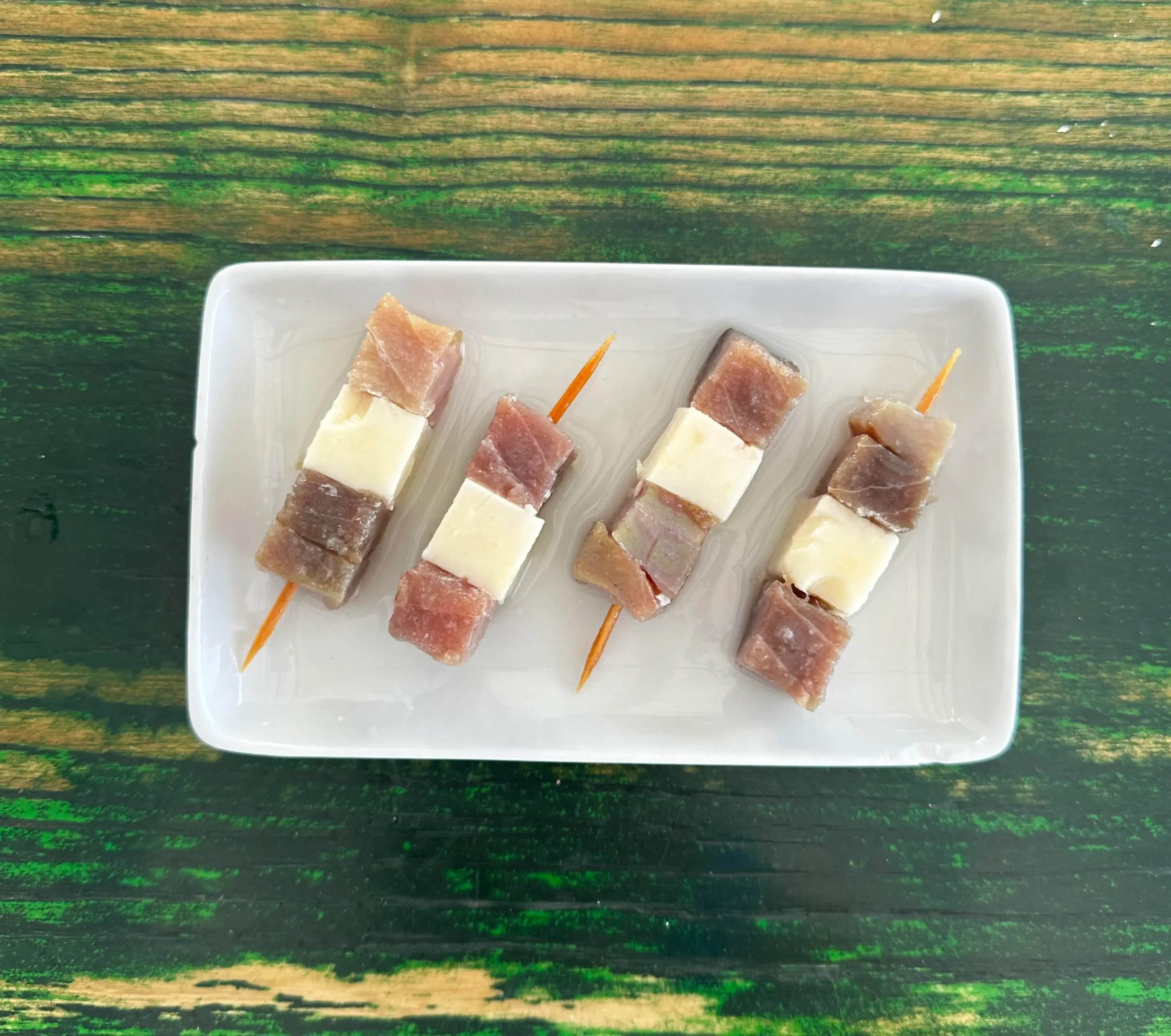 Atún en conserva, queso curado, cebolla encurtida, aceite de oliva virgen extra.