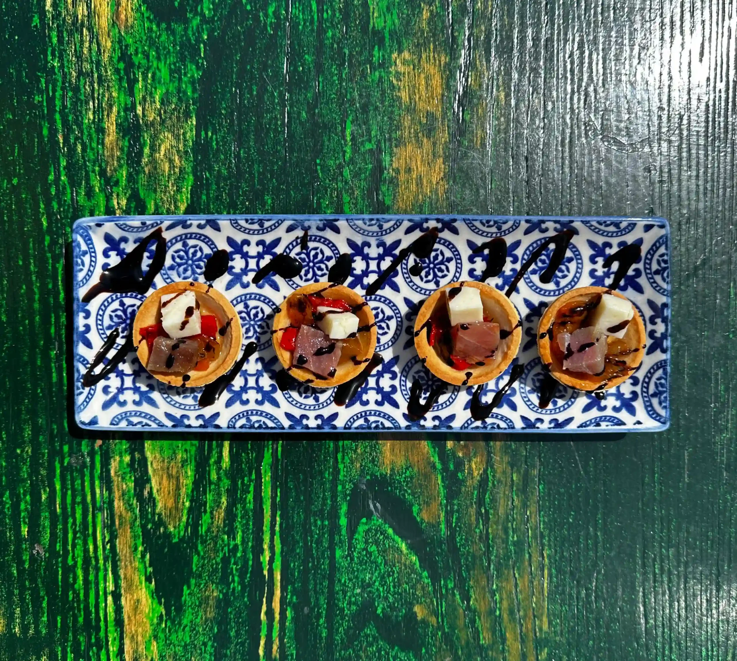 Canastillas de masa, pimientos asados, queso curado, jamón curado, reducción de vinagre balsámico.