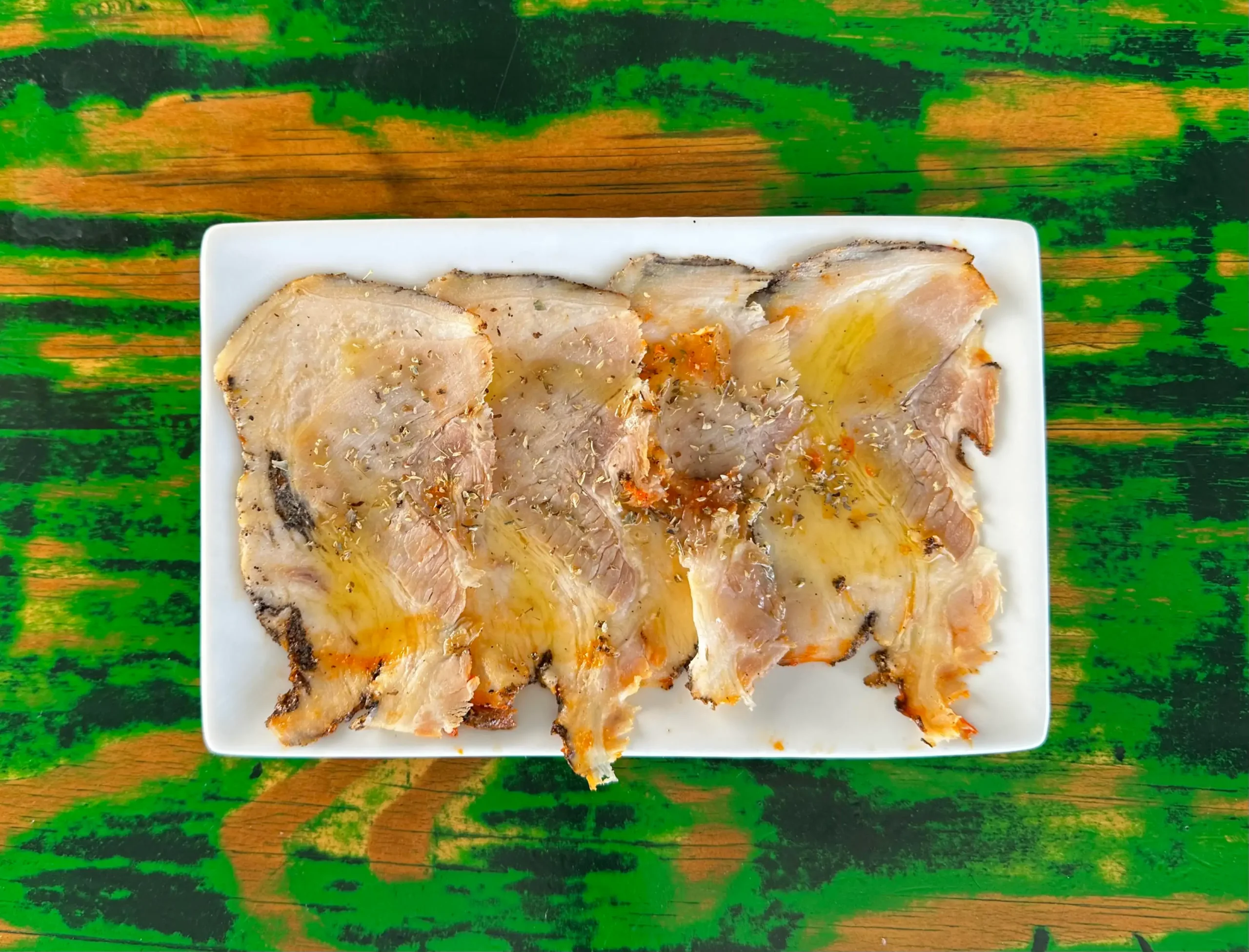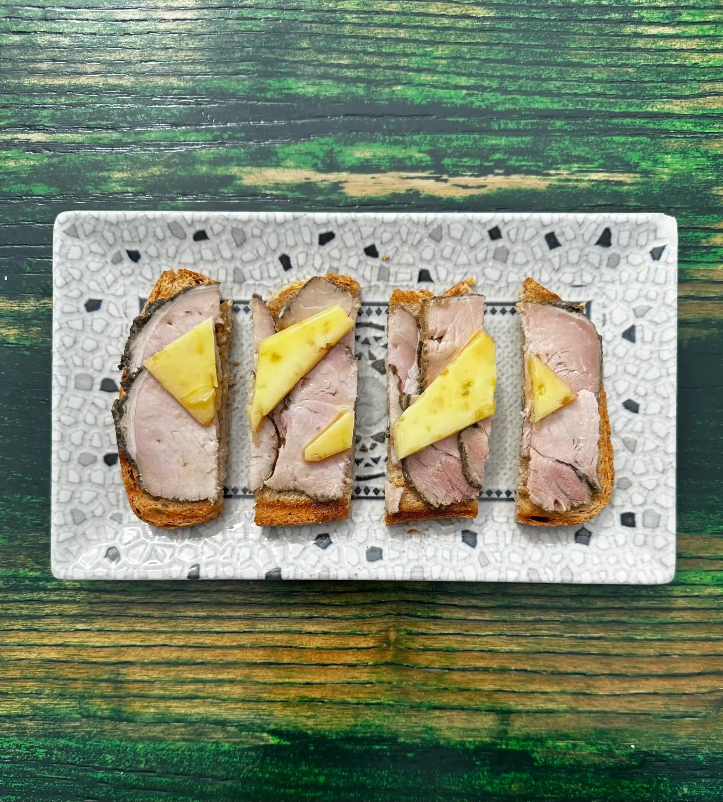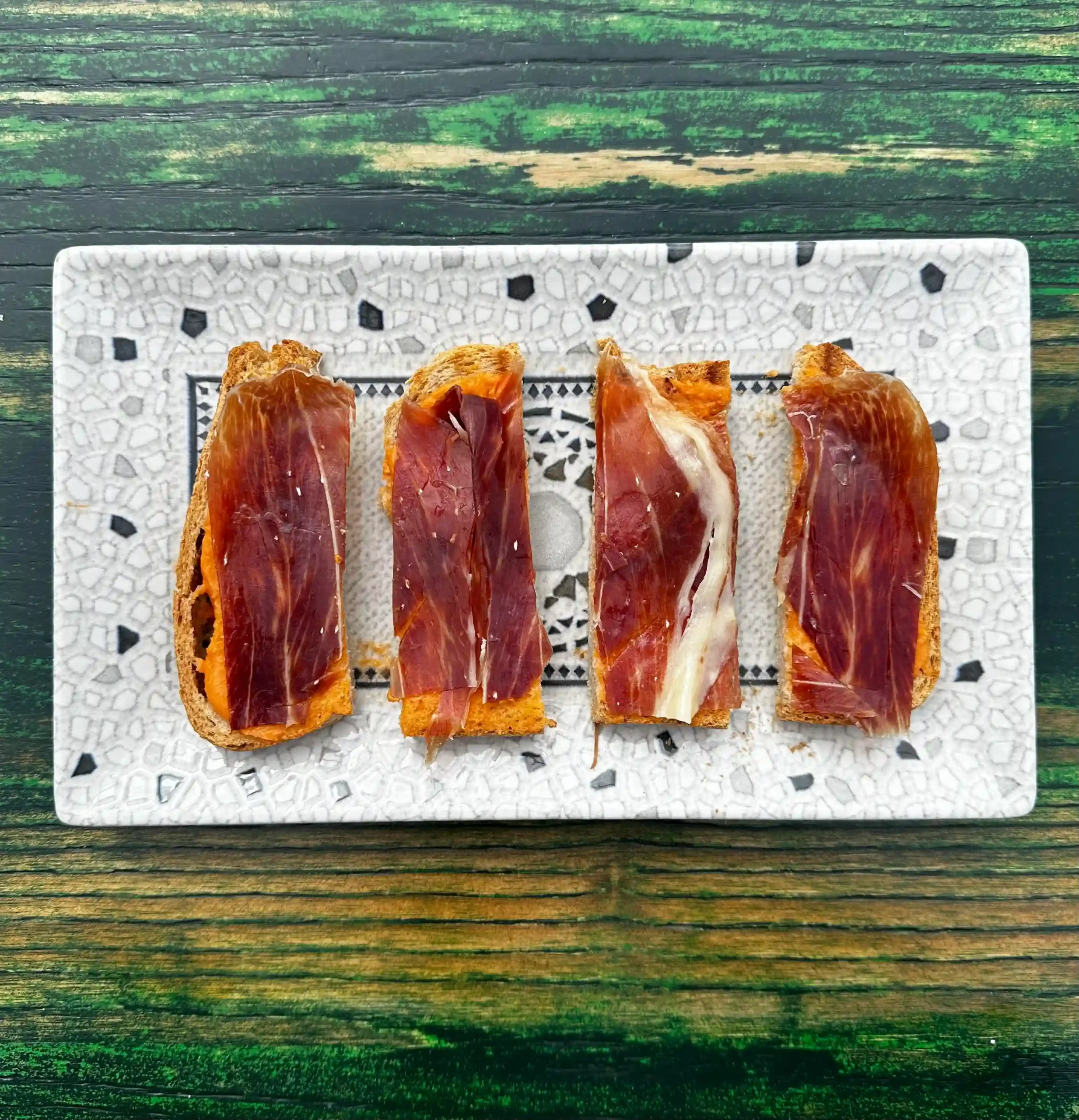 Pan crujiente, lomo de cerdo, queso curado, aceite de oliva virgen extra.