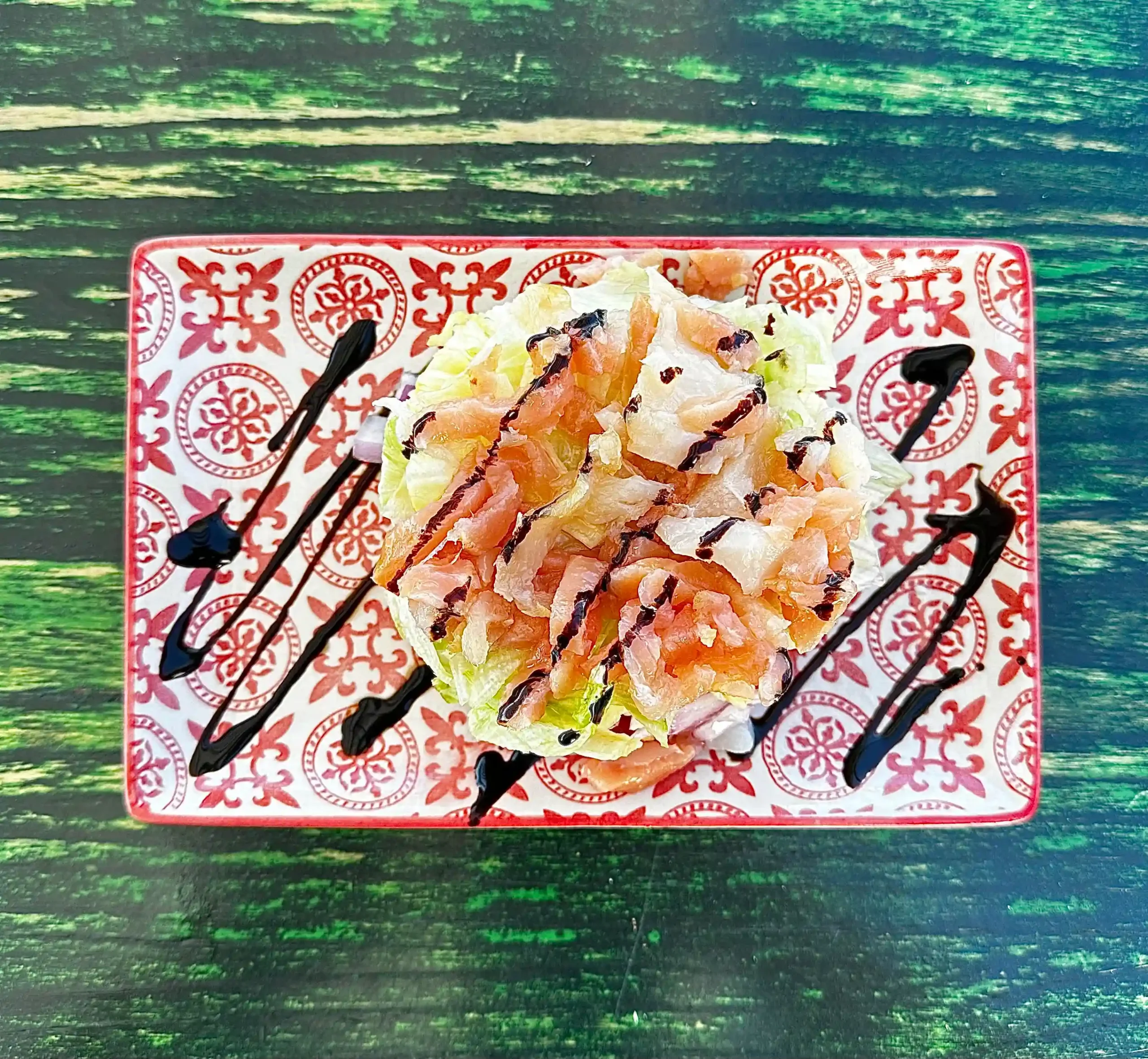 Salmón ahumado, gambas cocidas, surimi, lechuga, tomate cherry, cebolla morada, salsa rosa, eneldo, huevo cocido.