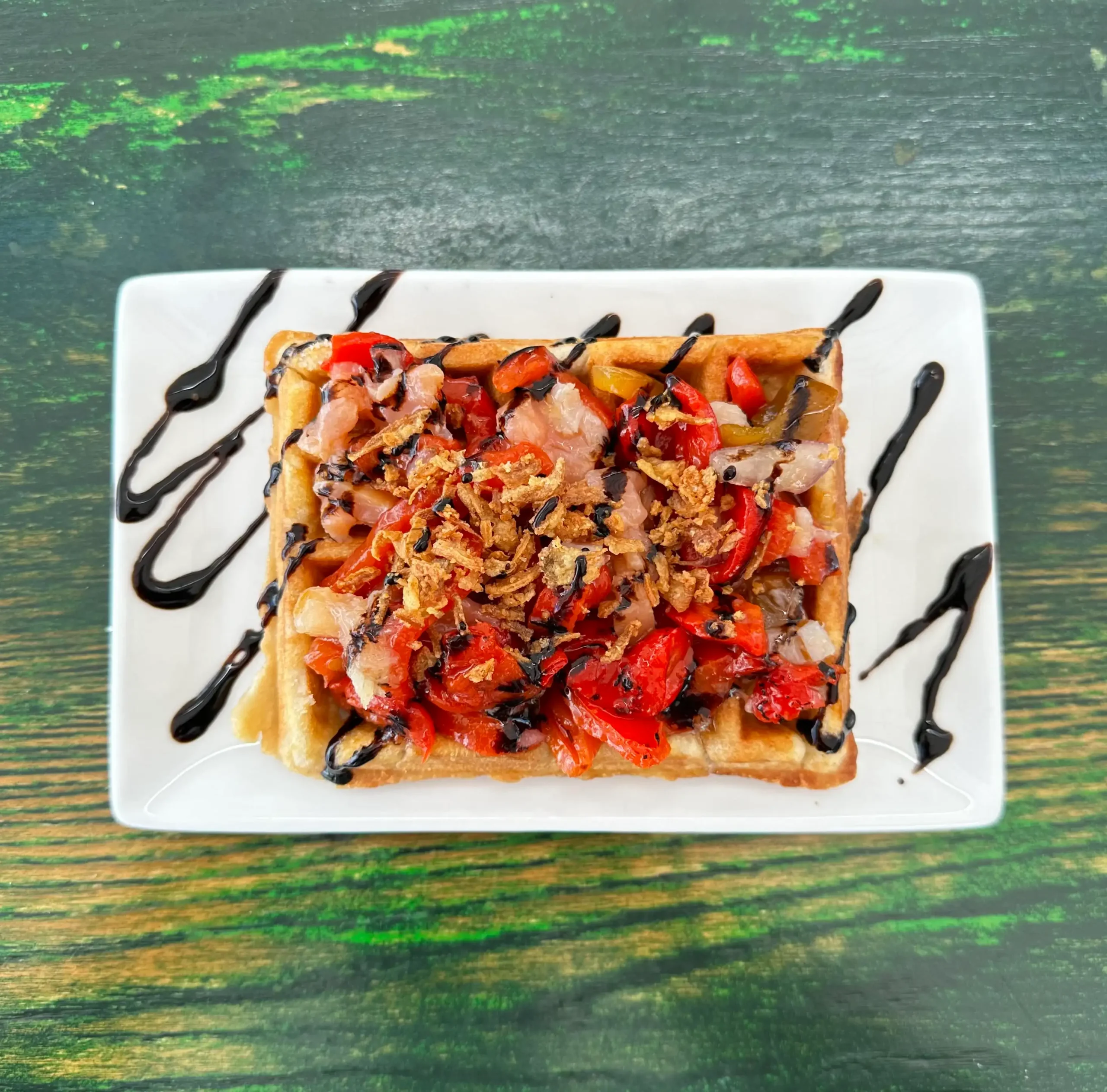 Gofre, pimientos asados, jamón curado, cebolla, cebolla frita crujiente, reducción de vinagre balsámico.