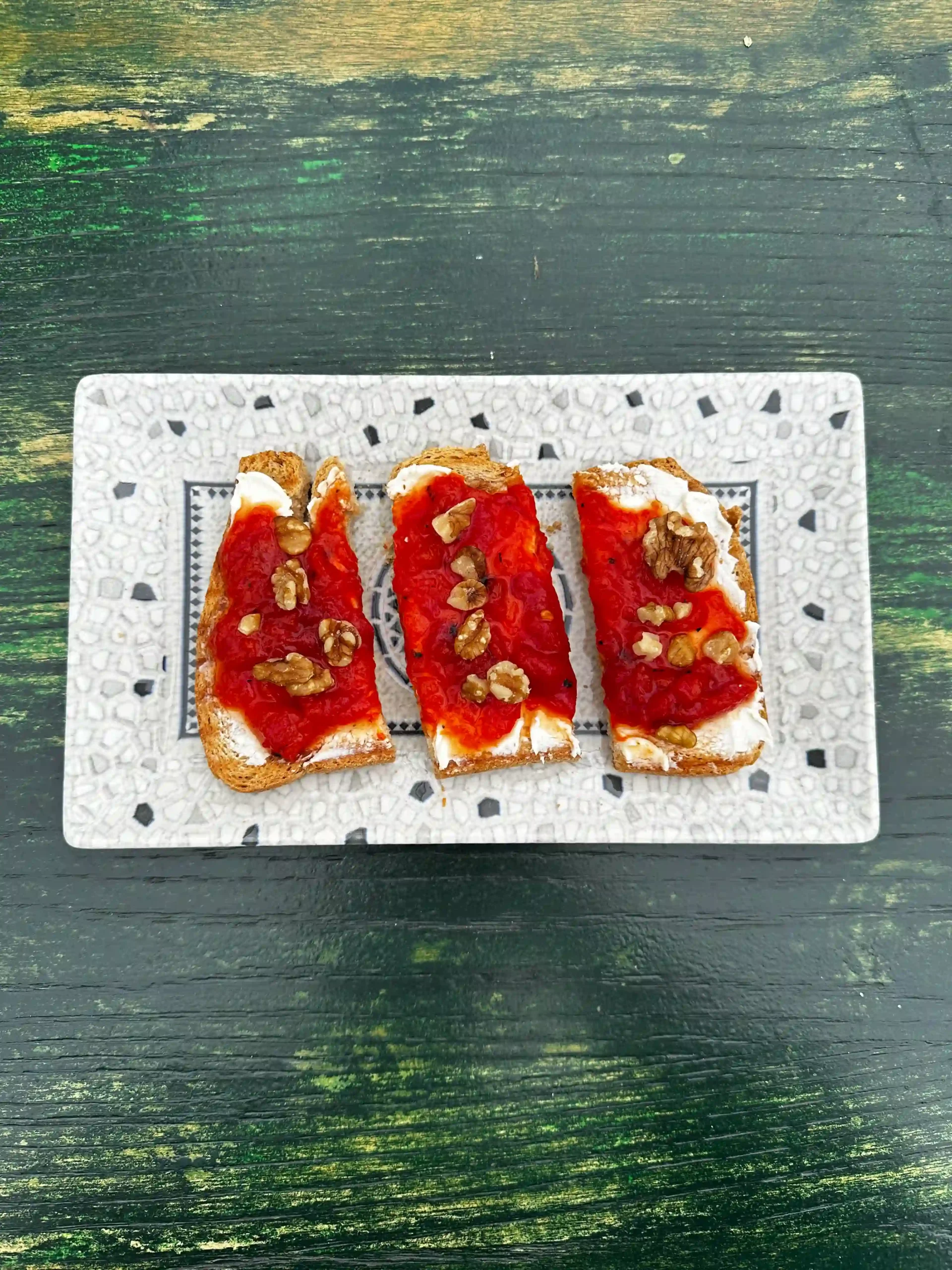 Pan crujiente, rulo de cabra, pimientos caramelizados, nueces, aceite de oliva virgen extra.