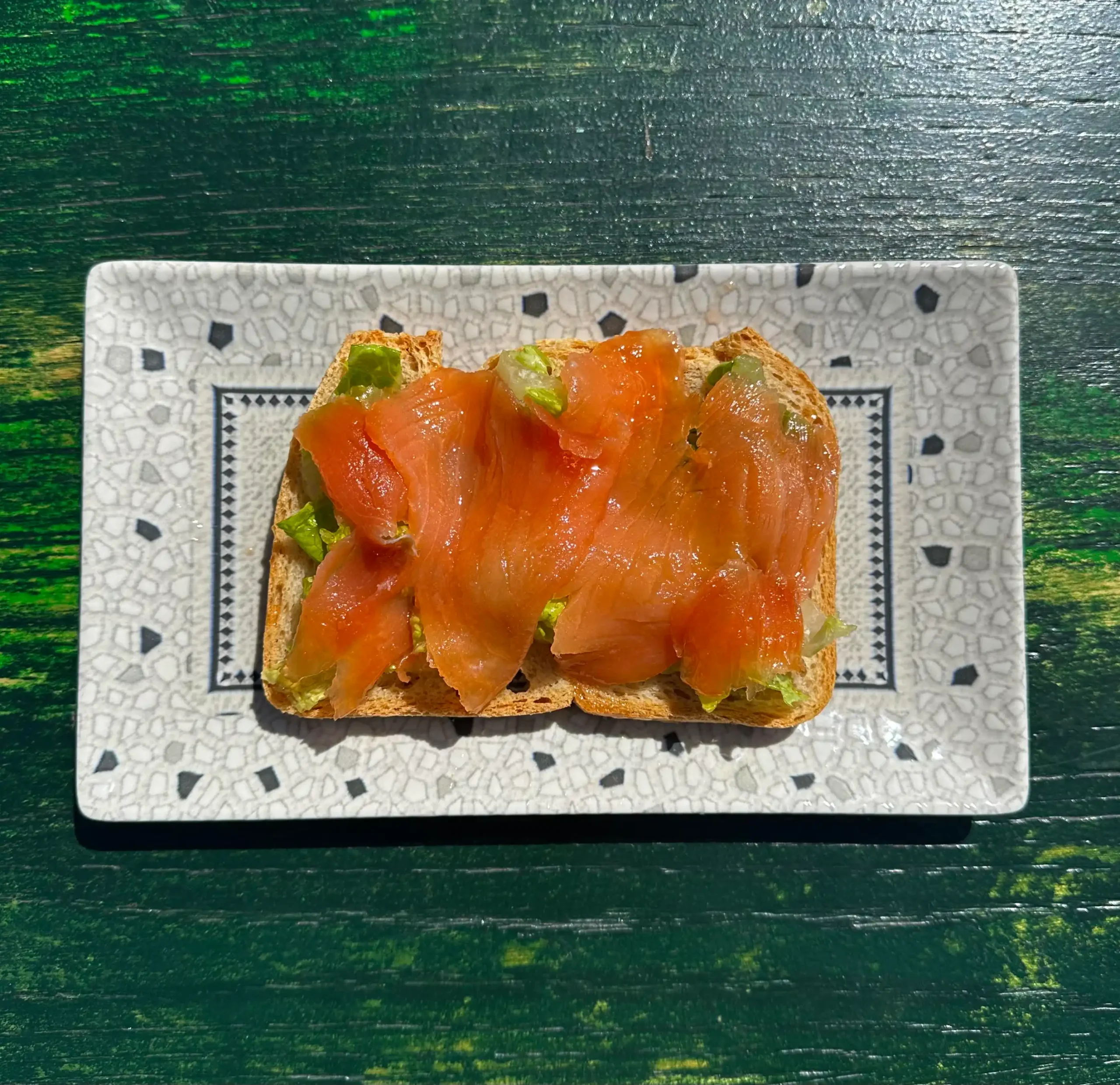 Pan crujiente, salmón ahumado, salsa nórdica (crema agria, eneldo, mostaza, miel, limón),