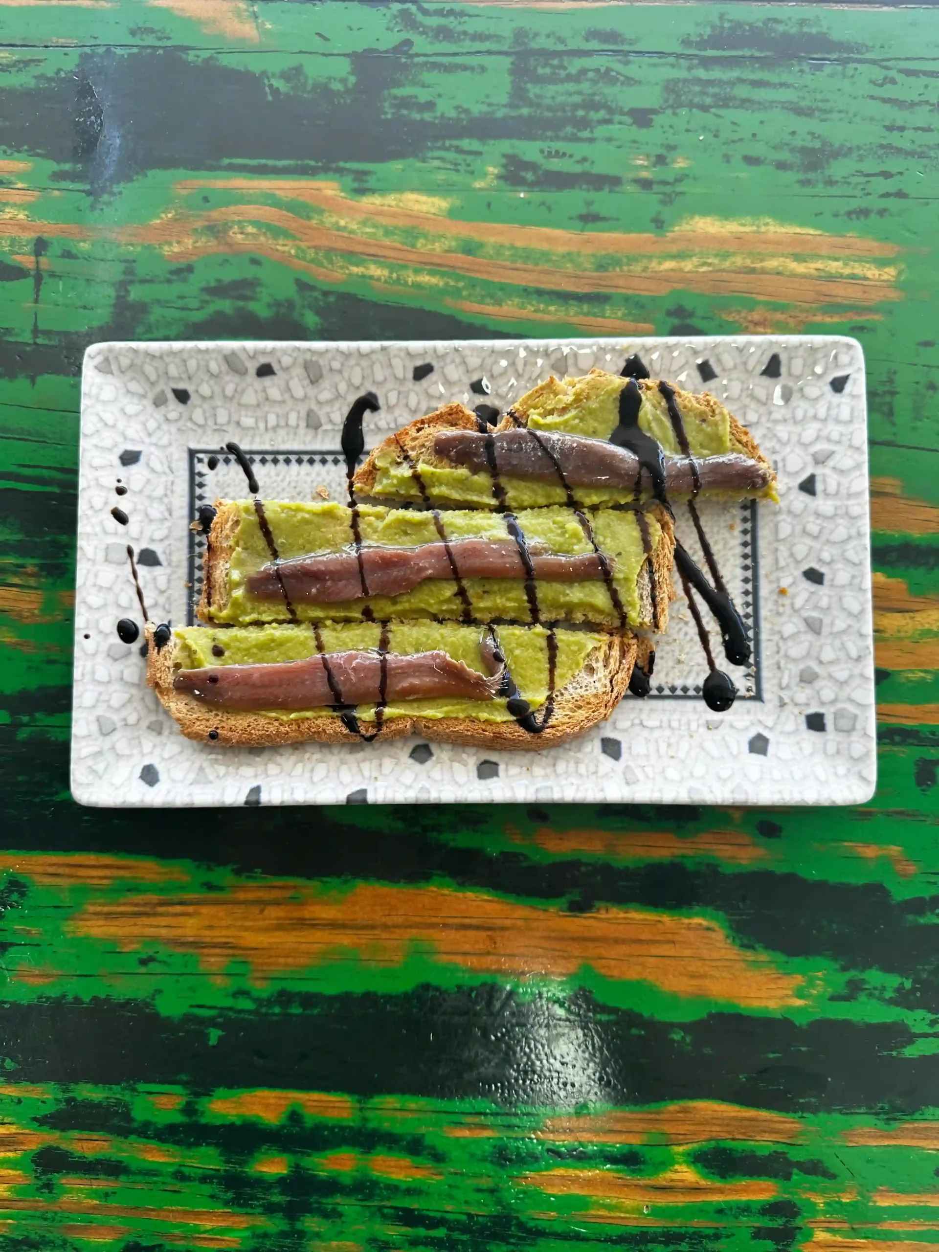 Pan crujiente, guacamole, anchoas, aceite de oliva virgen extra.